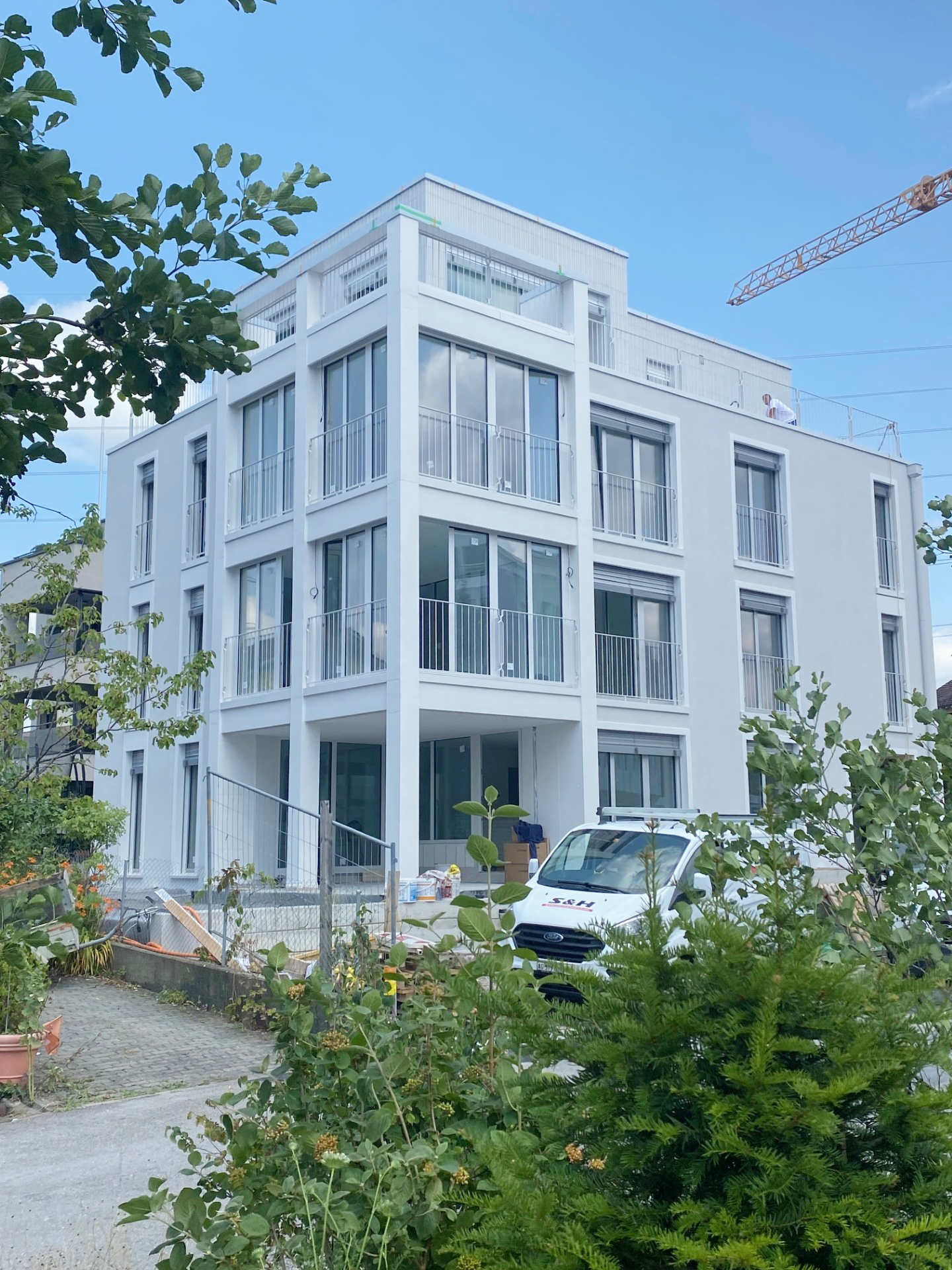 Beim Mehrfamilienhaus in Baar wurde diese Woche das Gerüst entfernt und die helle Fassade kam zum Vorschein. Auf dieser Parzelle wurde ein Wohnhaus abgerissen und es entstand ein dreigeschossiger Neubau mit einem Attikageschoss. Total werden hier vier neue Wohnungen entstehen.