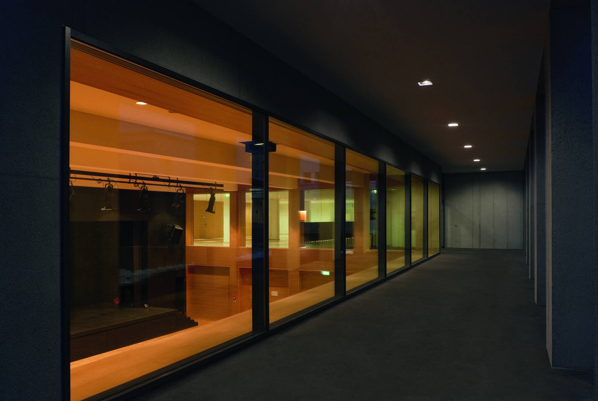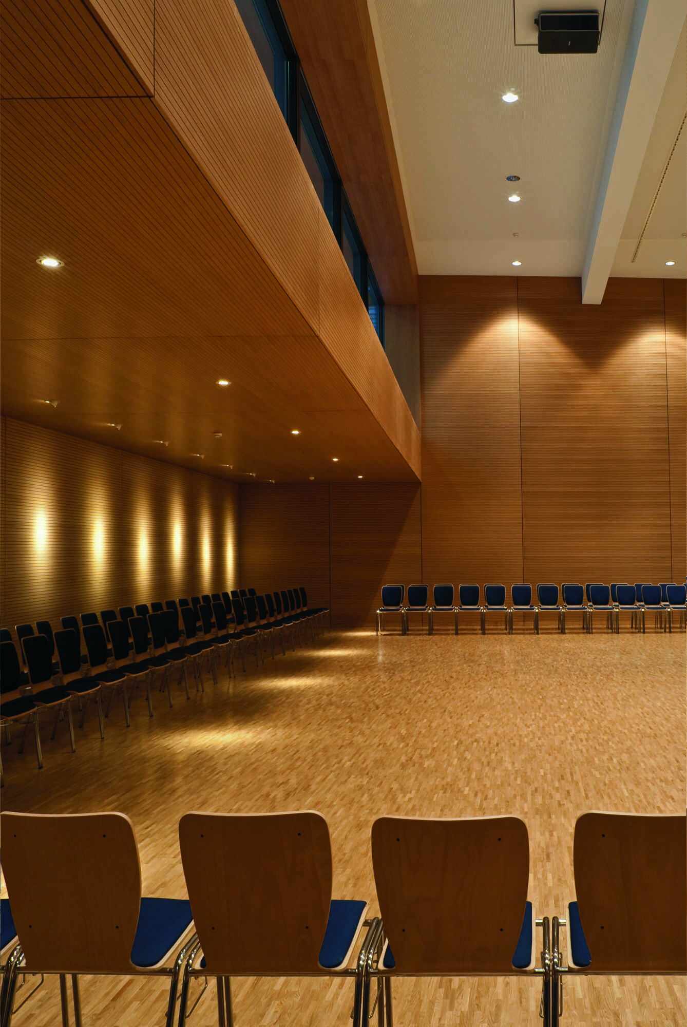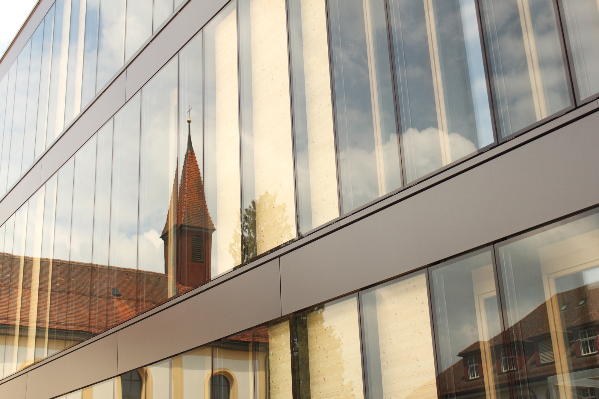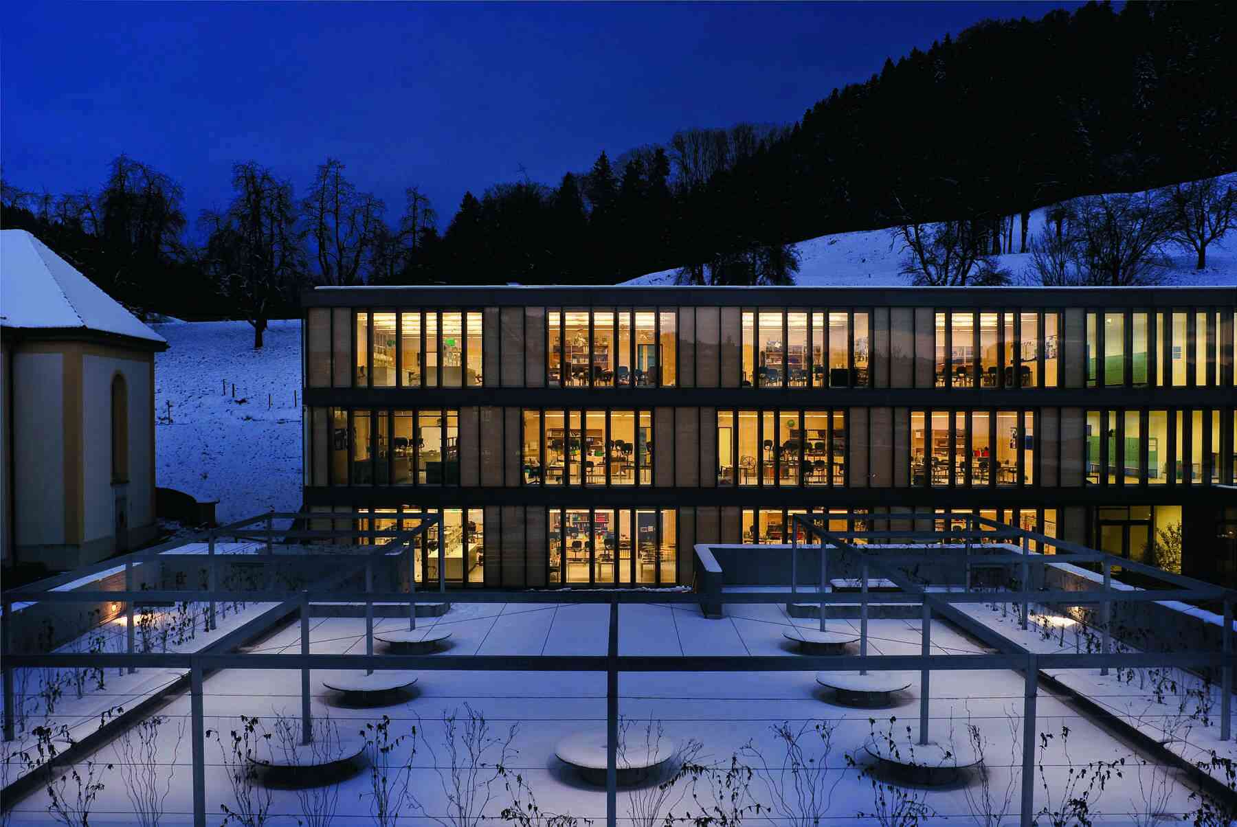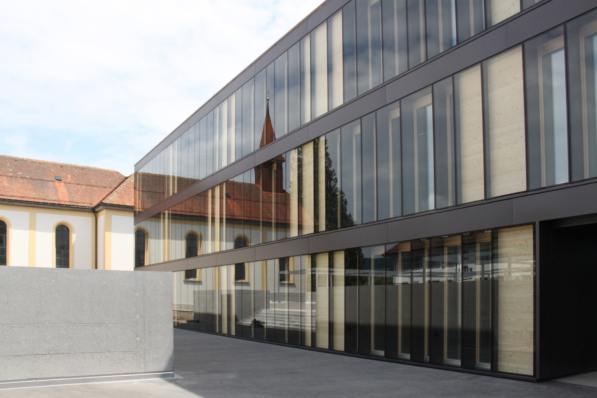 Das neue Schulhaus der Mittelschule, mit 13 Klassenzimmern und 3 Labors, fasst den Raum zwischen der Kirche und dem Wettingerhaus. Im entstandenen Hof steht die neue Aula, mit 450 Sitzplätzen, welche ein Geschoss tiefer gelegt wurde. Damit konnte die natürliche Höhendifferenz aufgenommen werden und es entstand ein Pausenhof auf zwei unterschiedlichen Ebenen.
