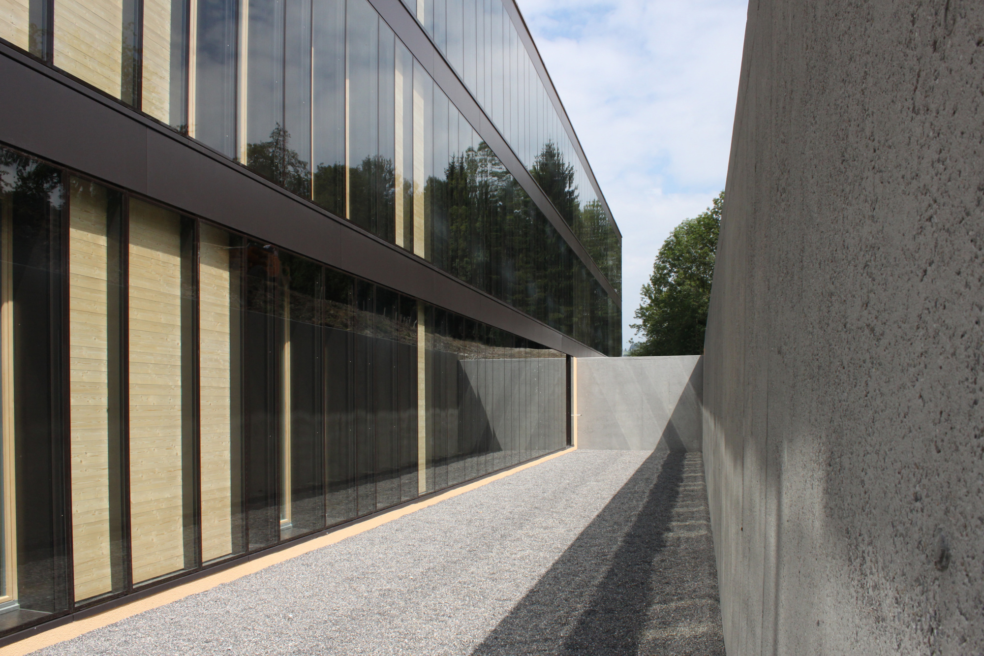 Das gesamte Gebäude ist ein Holzbau mit einfachem Konzept. Das transparente Gebäude, das aus Platten und inneren „Stützkörpern“ besteht, begrenzt einerseits den Hofraum, lässt infolge seiner Transparenz aber auch zu, dass der umliegende Raum noch wahrgenommen wird. Die innen liegenden „Stützkörper“ sind die Klassenzimmer. Die Aula ist als abgesenkter Baukörper in die terrassenartig ausgebildete Umgebungsgestaltung des Hofraumes eingebettet und wurde in Massivbauweise erstellt.