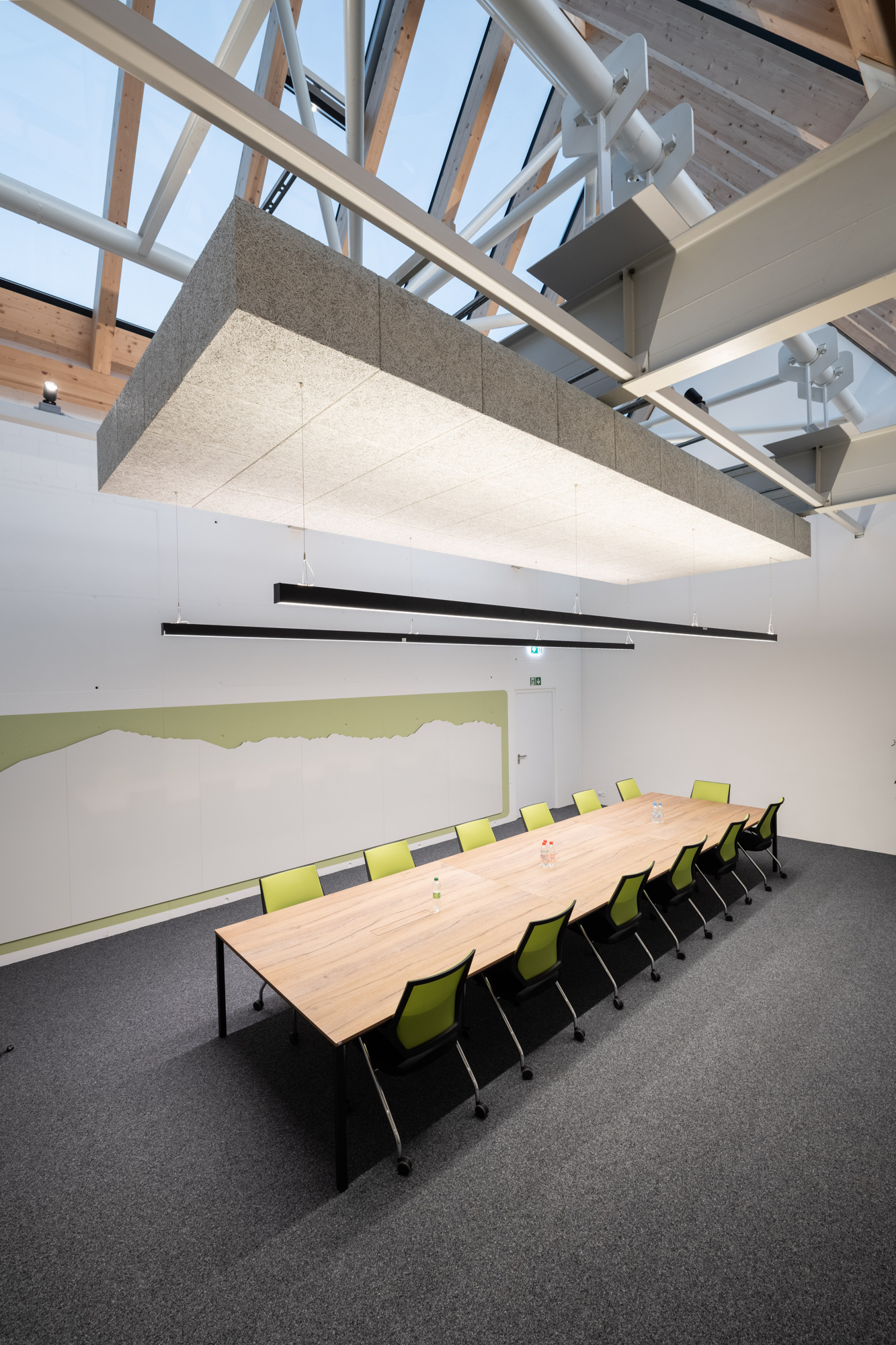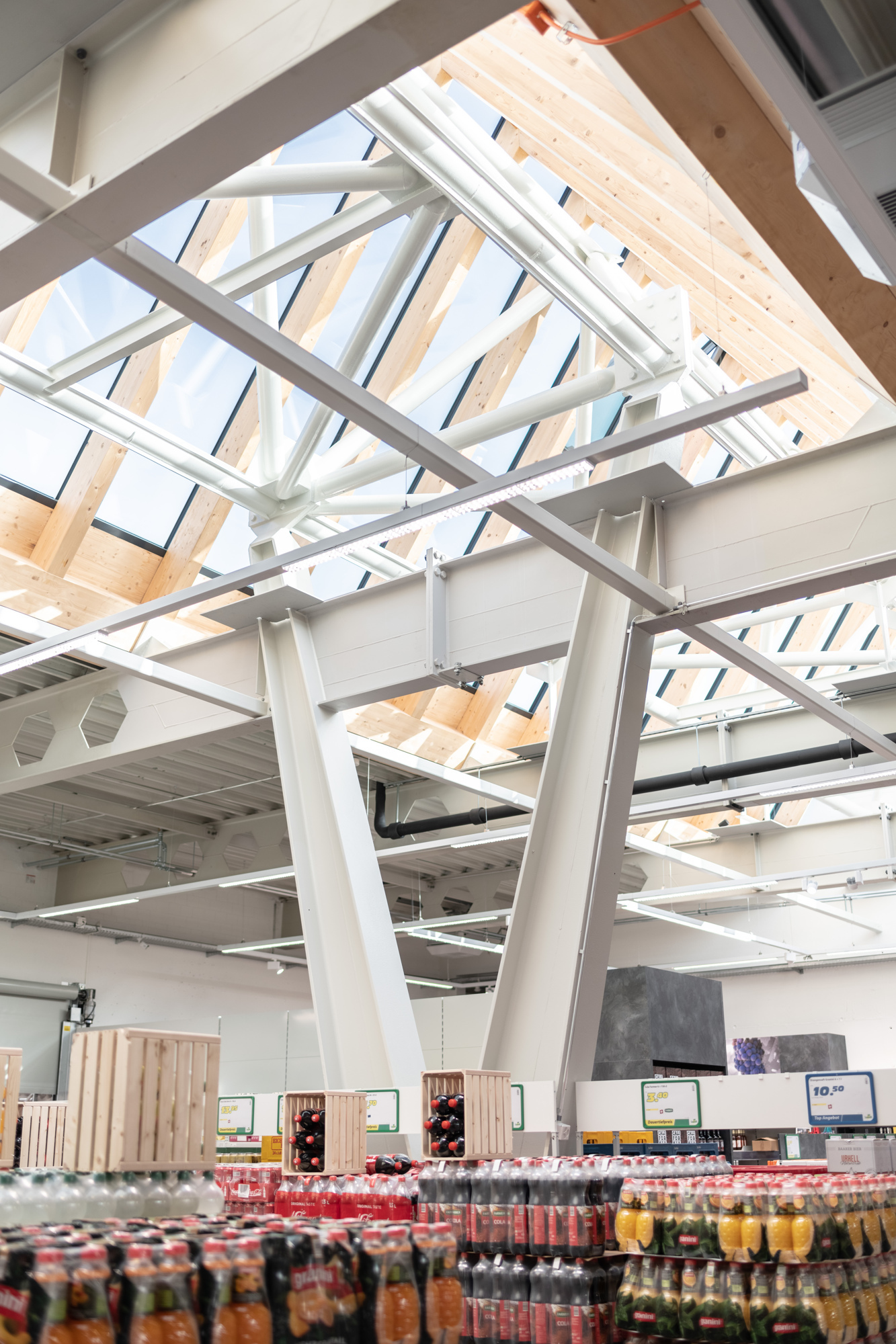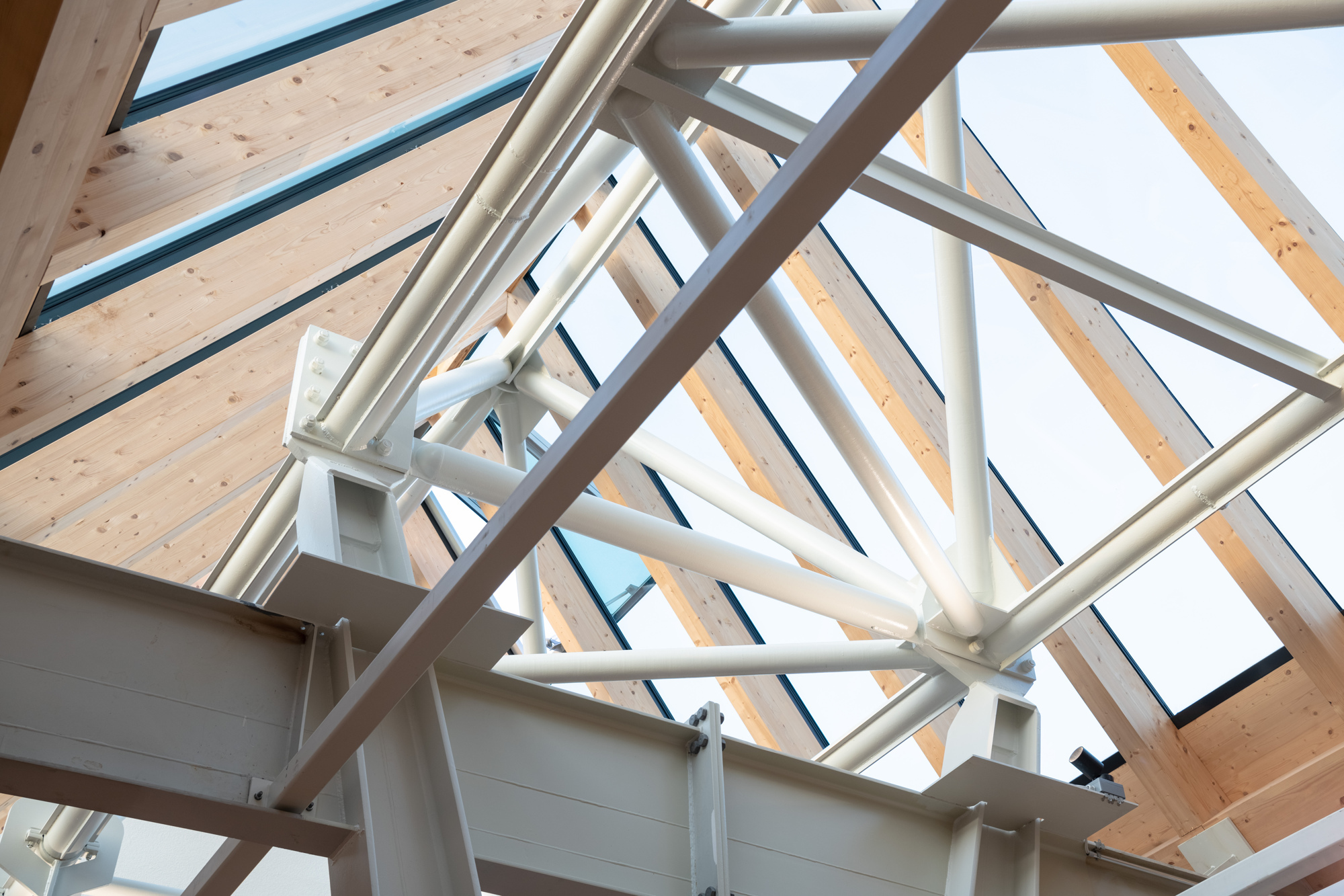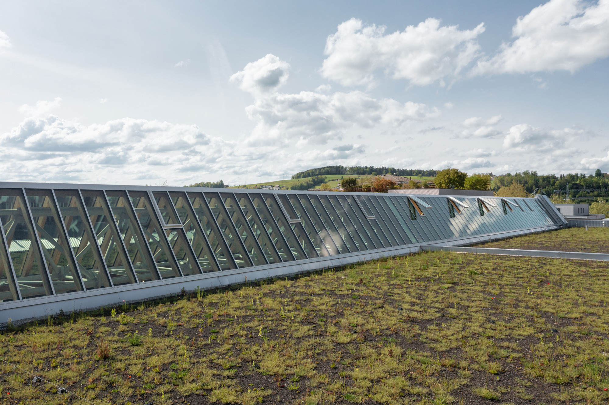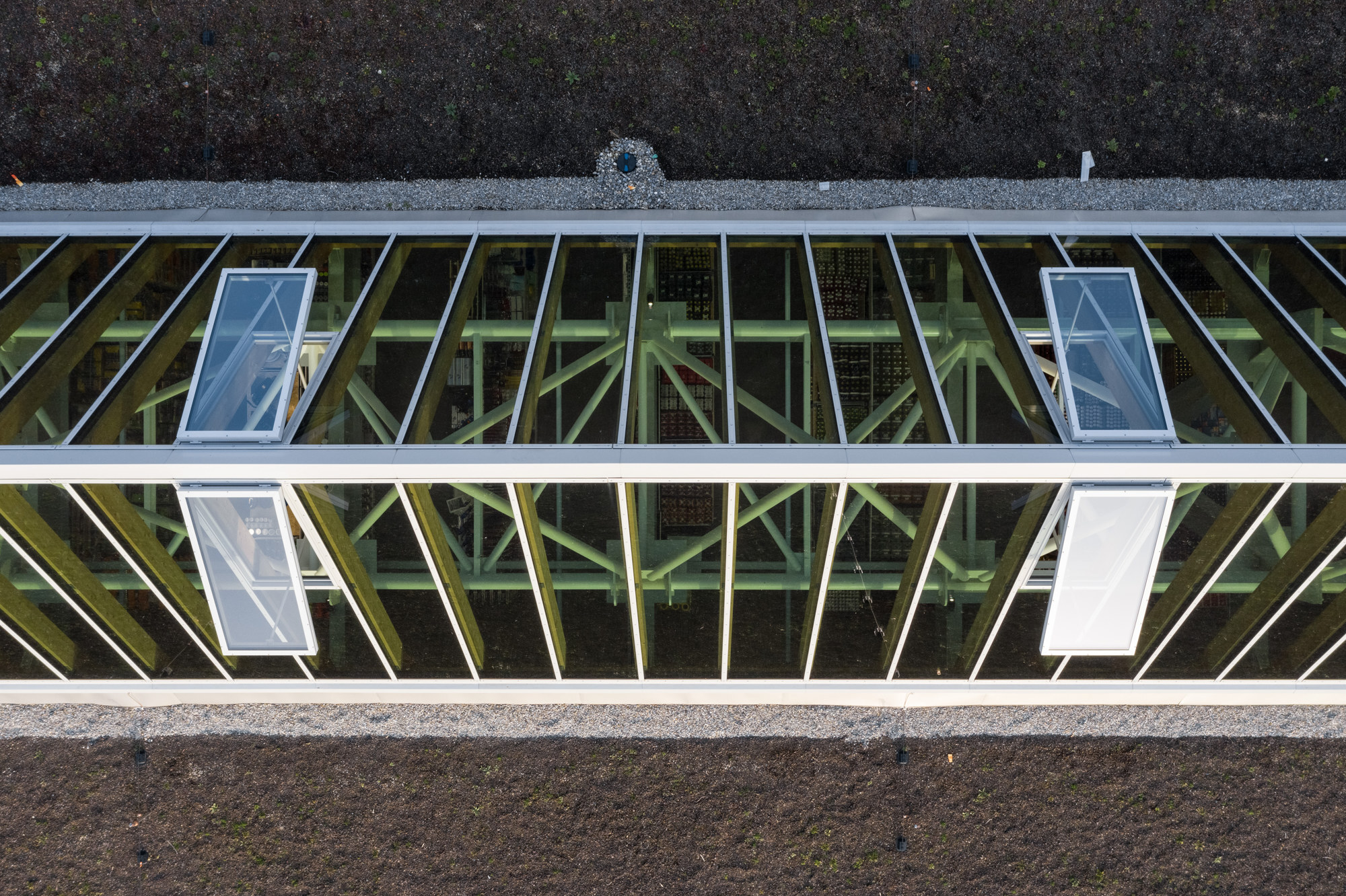 Über dem Fachwerkträger wurde über die ganze Länge ein Glas- dach erschaffen. Damit wurde die Konstruktion vor der Witterung geschützt, und die ganze Halle ist in ihrer Mitte mit Tageslicht versorgt. Die Westfassade wurde komplett verglast, um den Nutzern des Gebäudes einen Sichtbezug zur Umgebung zu geben und den natürlichen Lichteinfall zu verstärken.