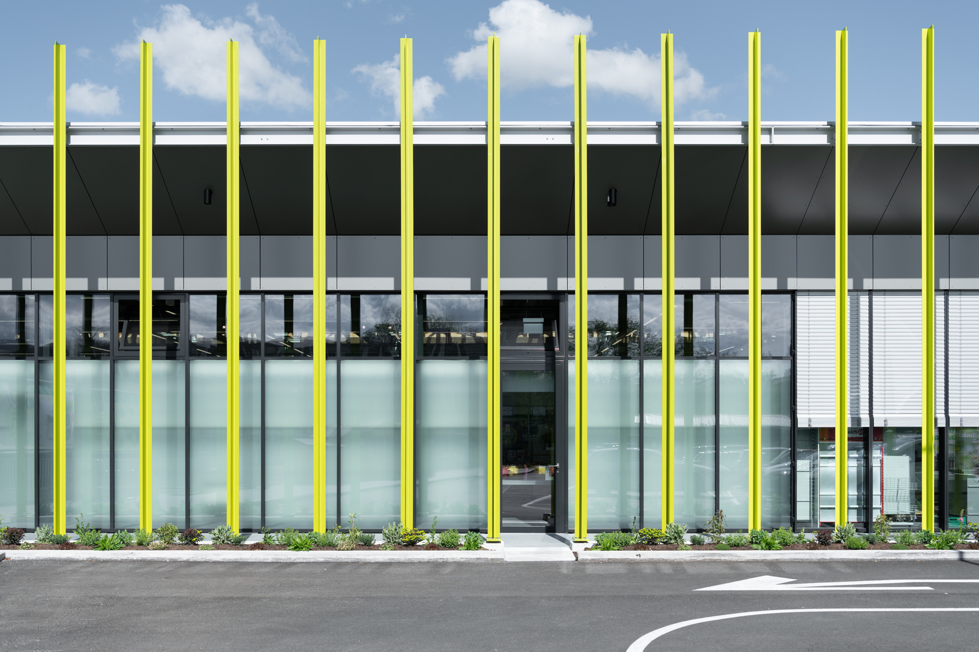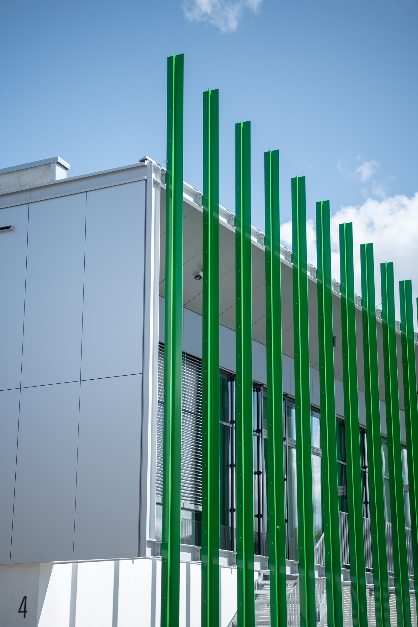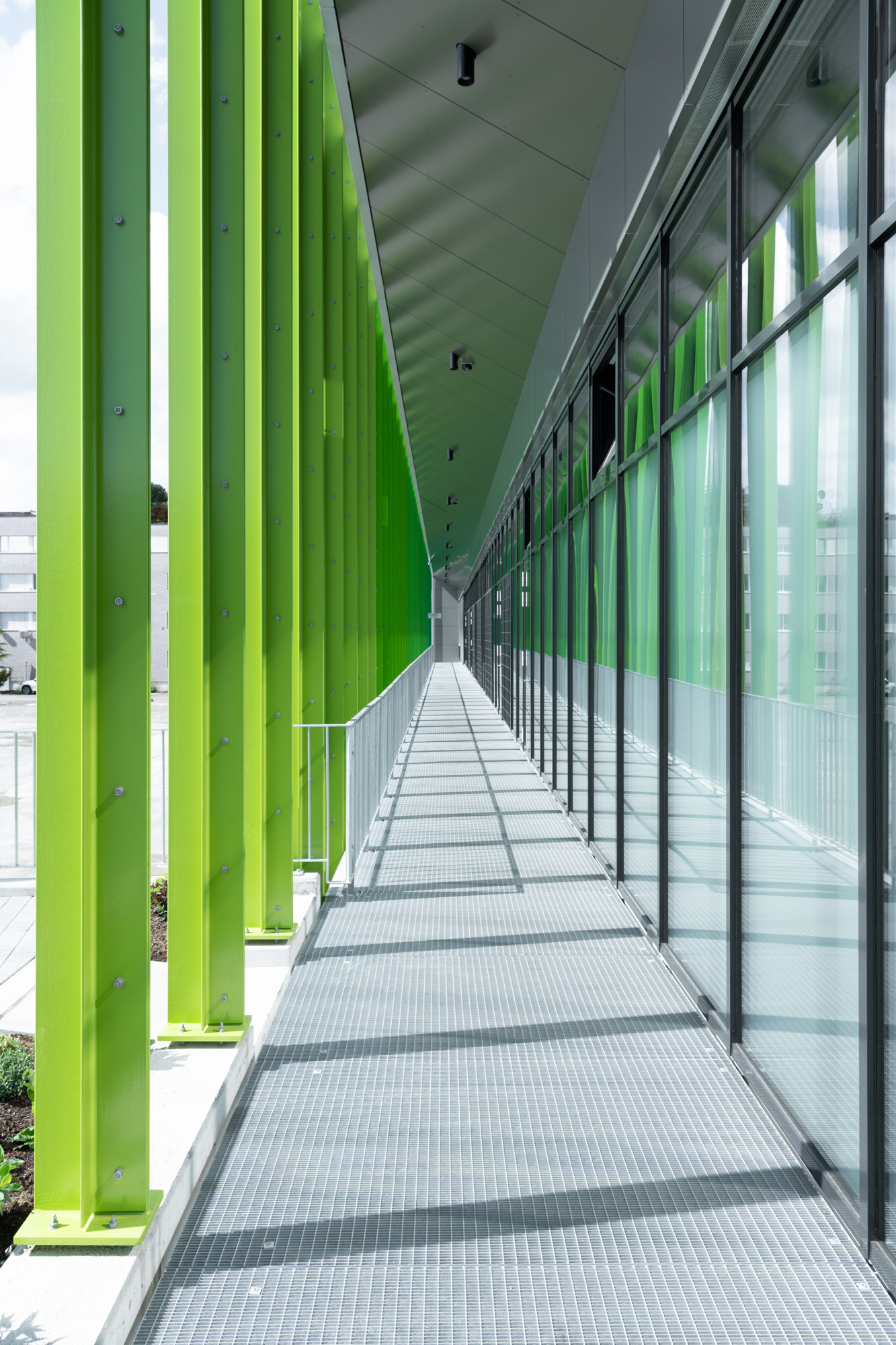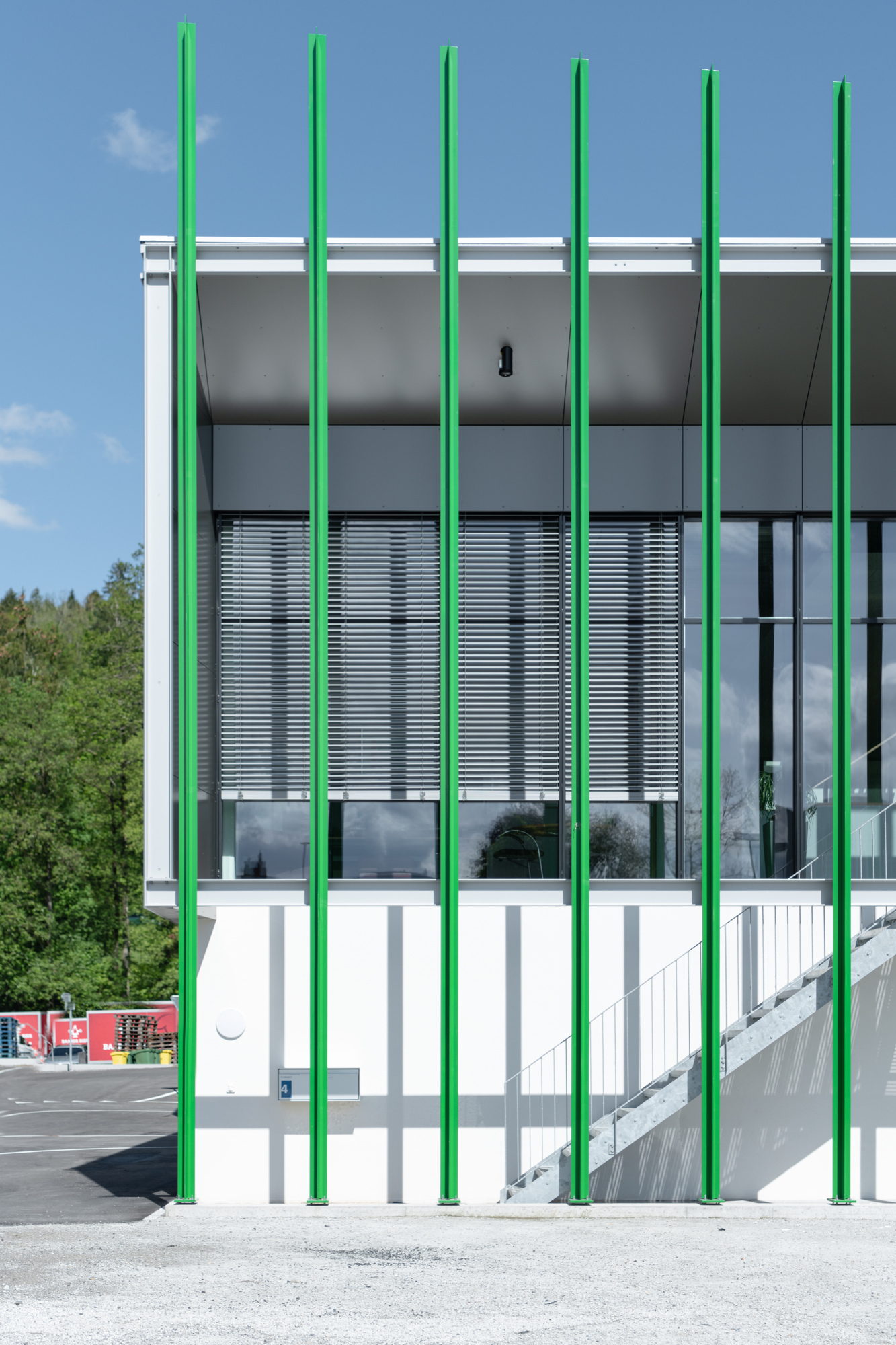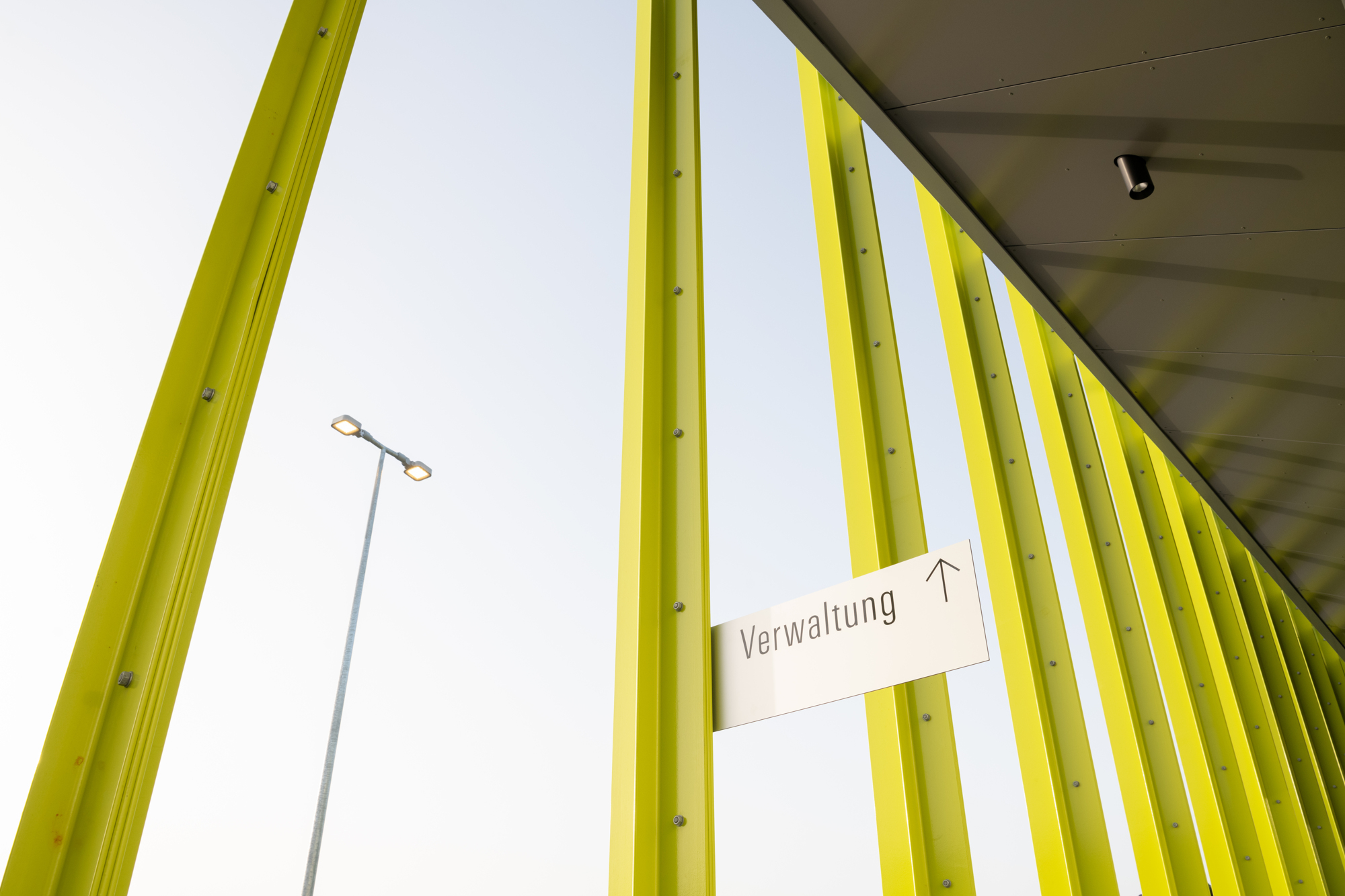 Vor der Westfassade würde eine Reihe von Kreuzstützen aufgestellt, die mittels eines Vordaches und eines Podestes eine Art Laubengang bilden, der die einzelnen Nutzungen verbindet. Die Stützen sind in einem Farbverlauf von Grün bis Gelb beschichtet, entsprechend der Firmenidentität der Landi.