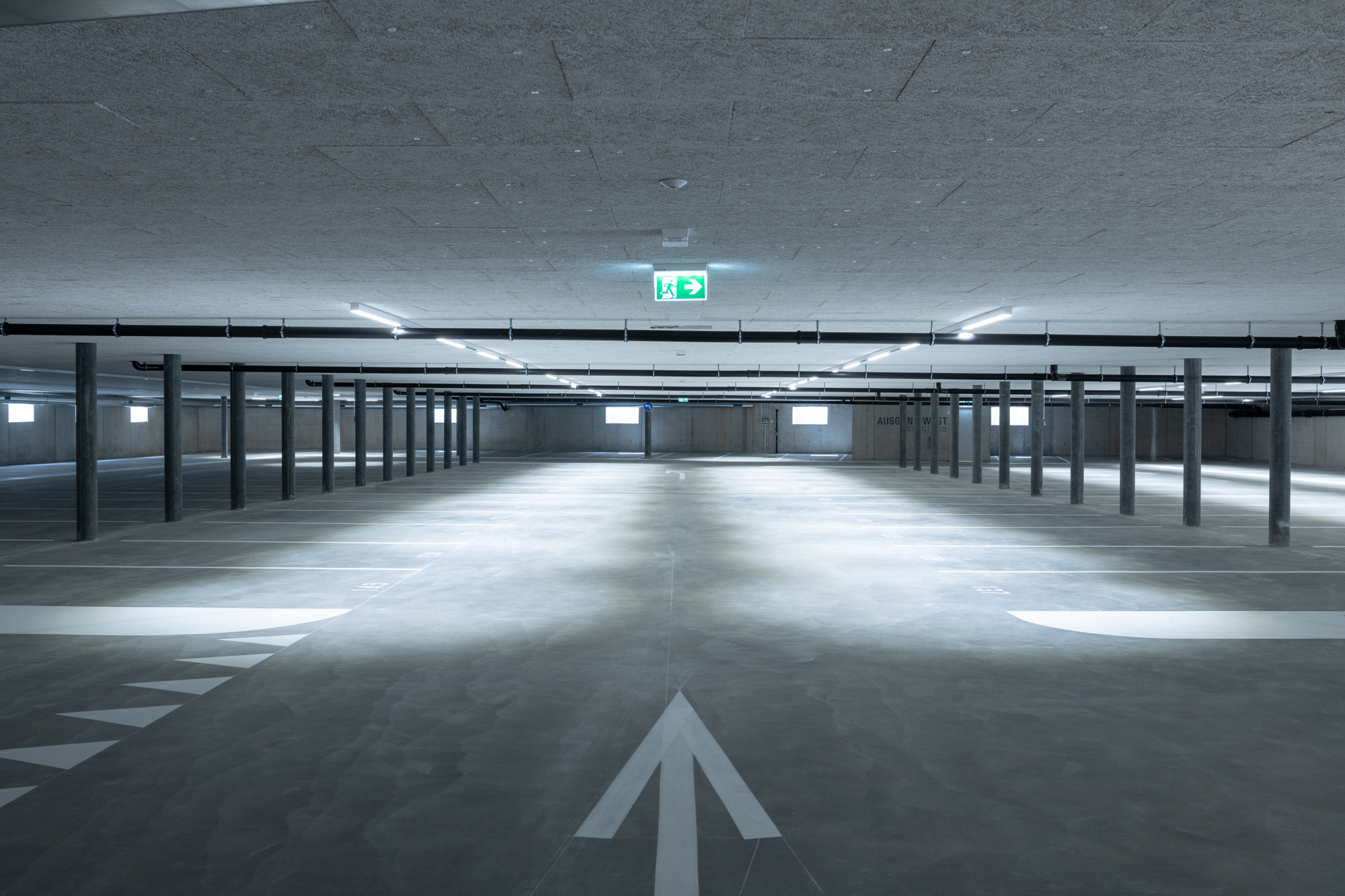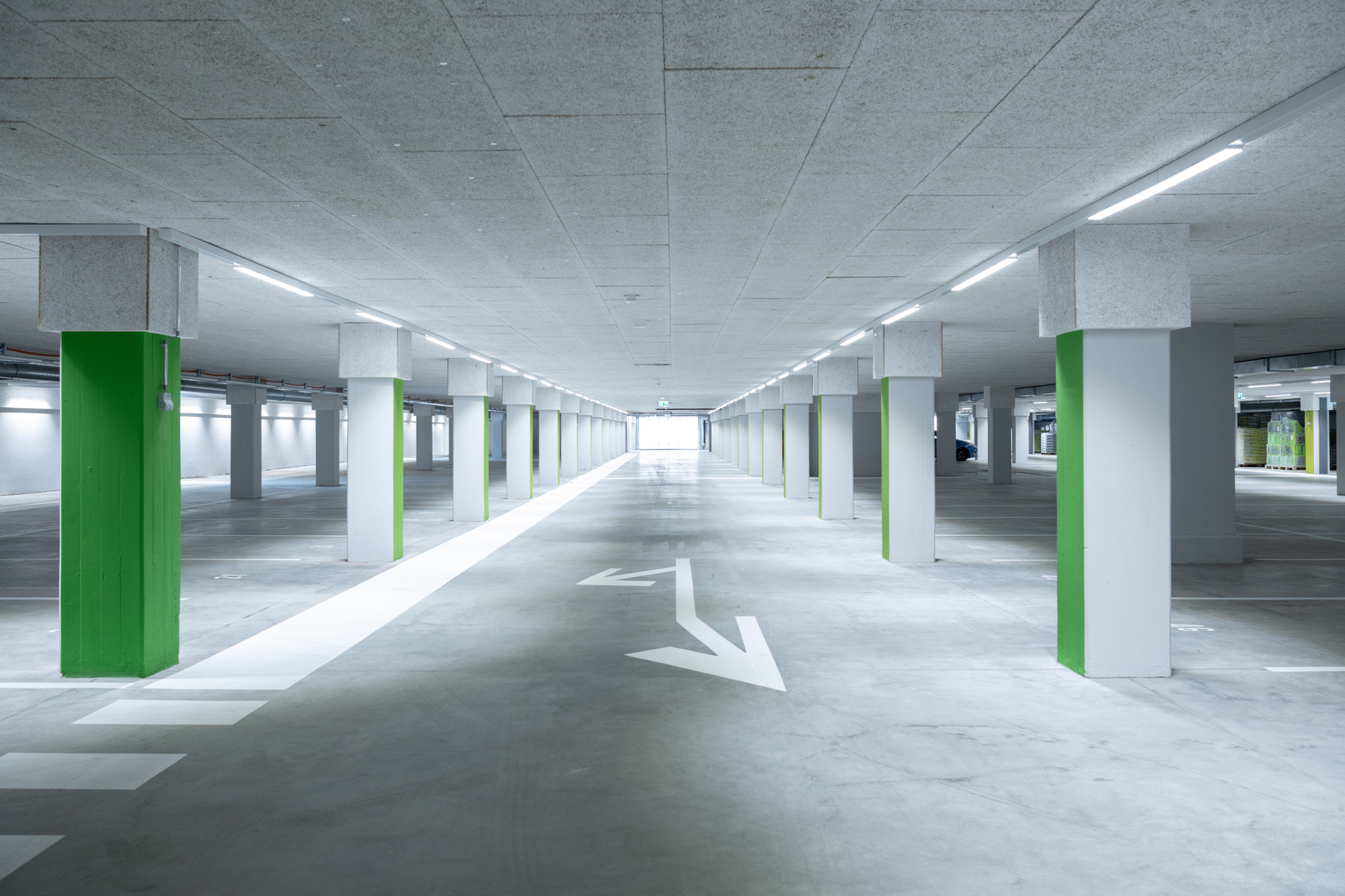 Vor der Halle wurde eine eingeschossige Tiefgarage gebaut, deren Decke als Parkdeck für die Kunden dient.