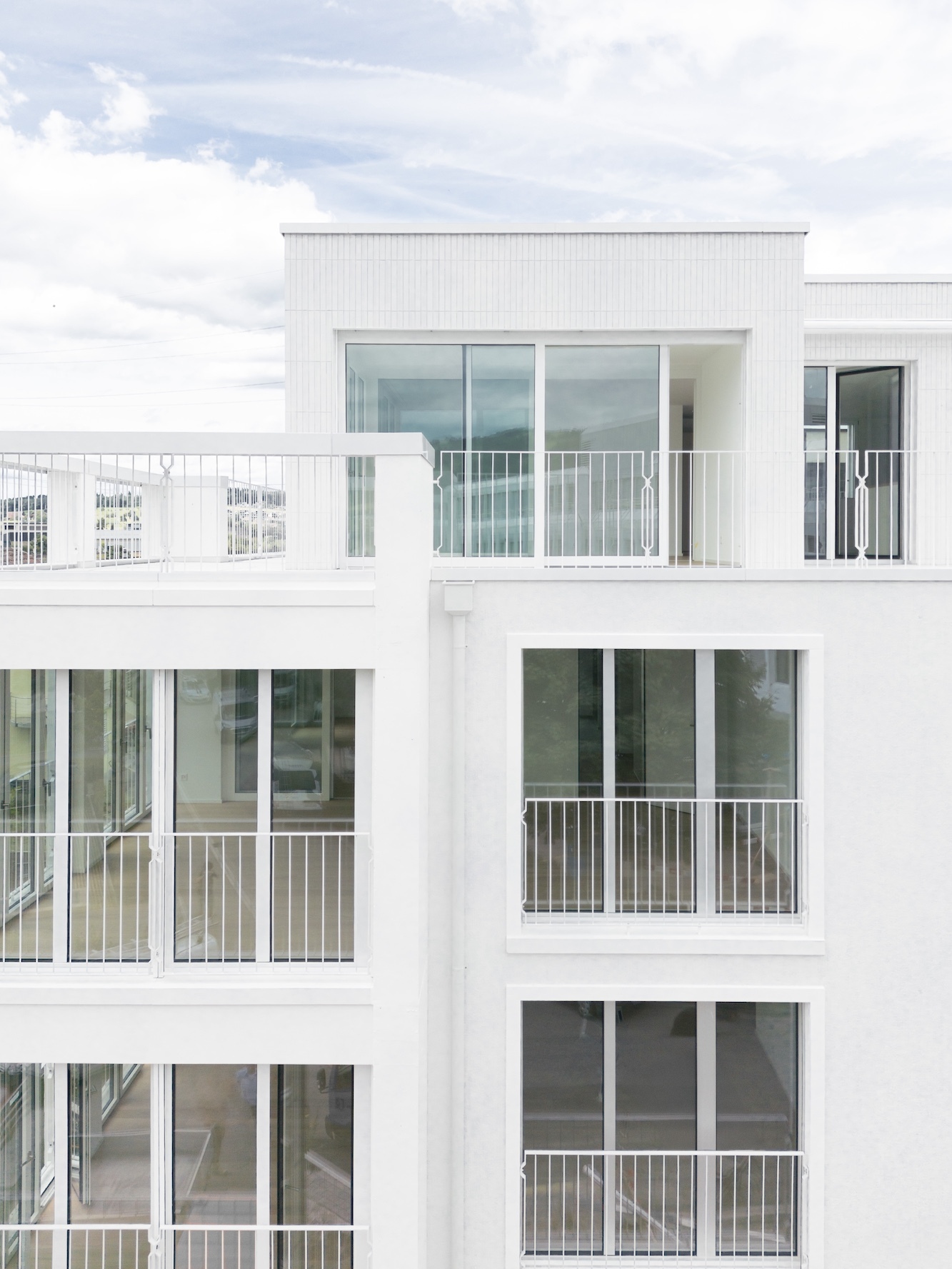 Die Gesamtwirkung ist einheitlich und zurückhaltend, trotz der geometrischen Versätze im Bereich der Loggien und des Attikageschosses. Dennoch bringen die sorgfältig durchdachten Details genug Tiefe und Spannung, um einer flachen Erscheinung der Fassaden entgegenwirken.