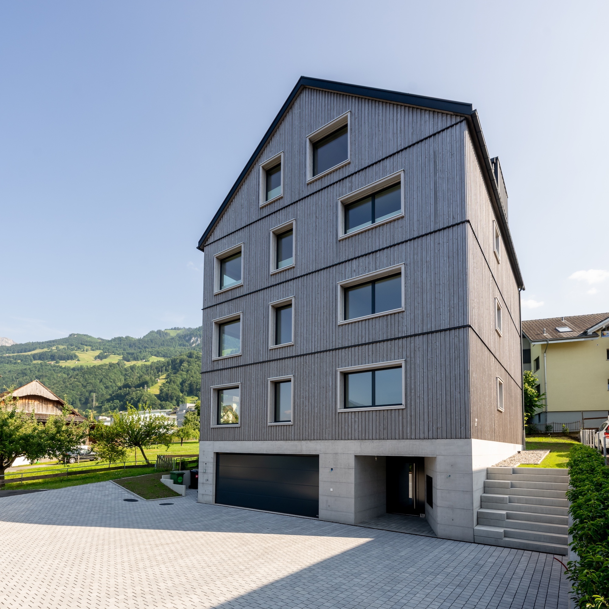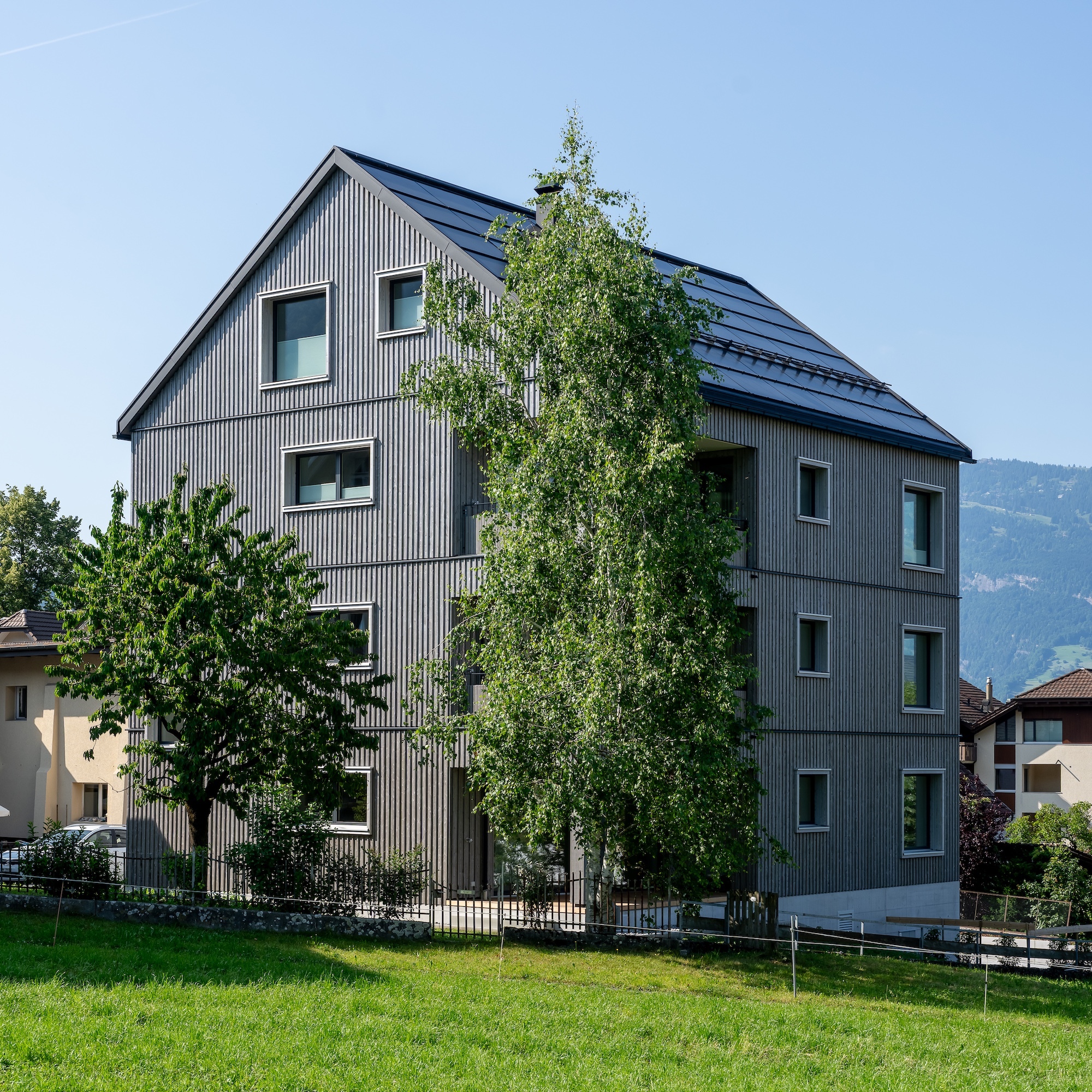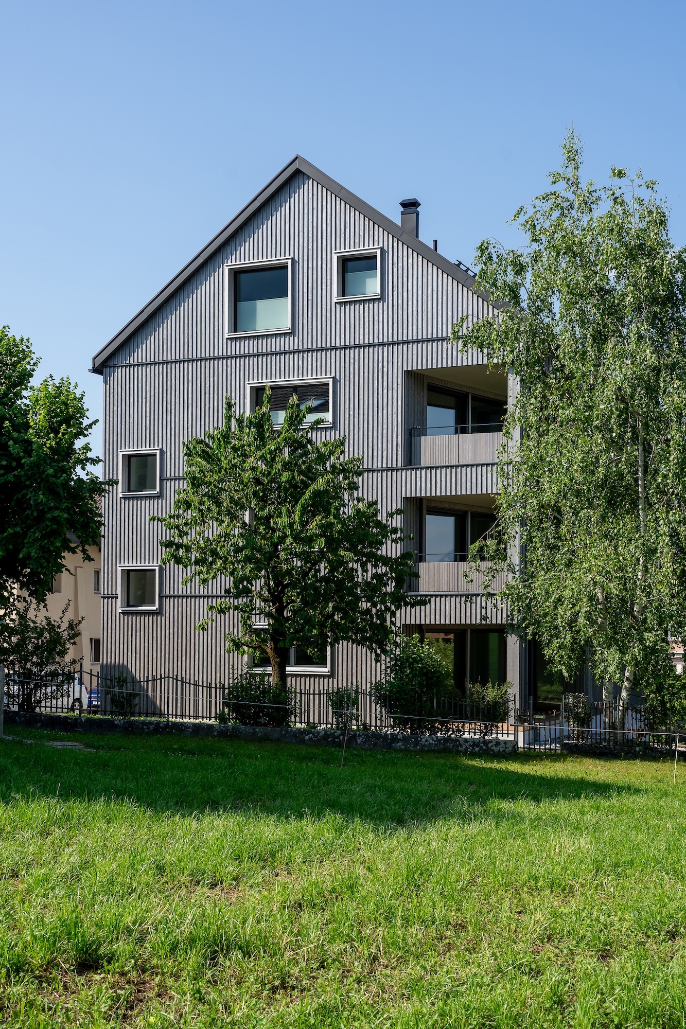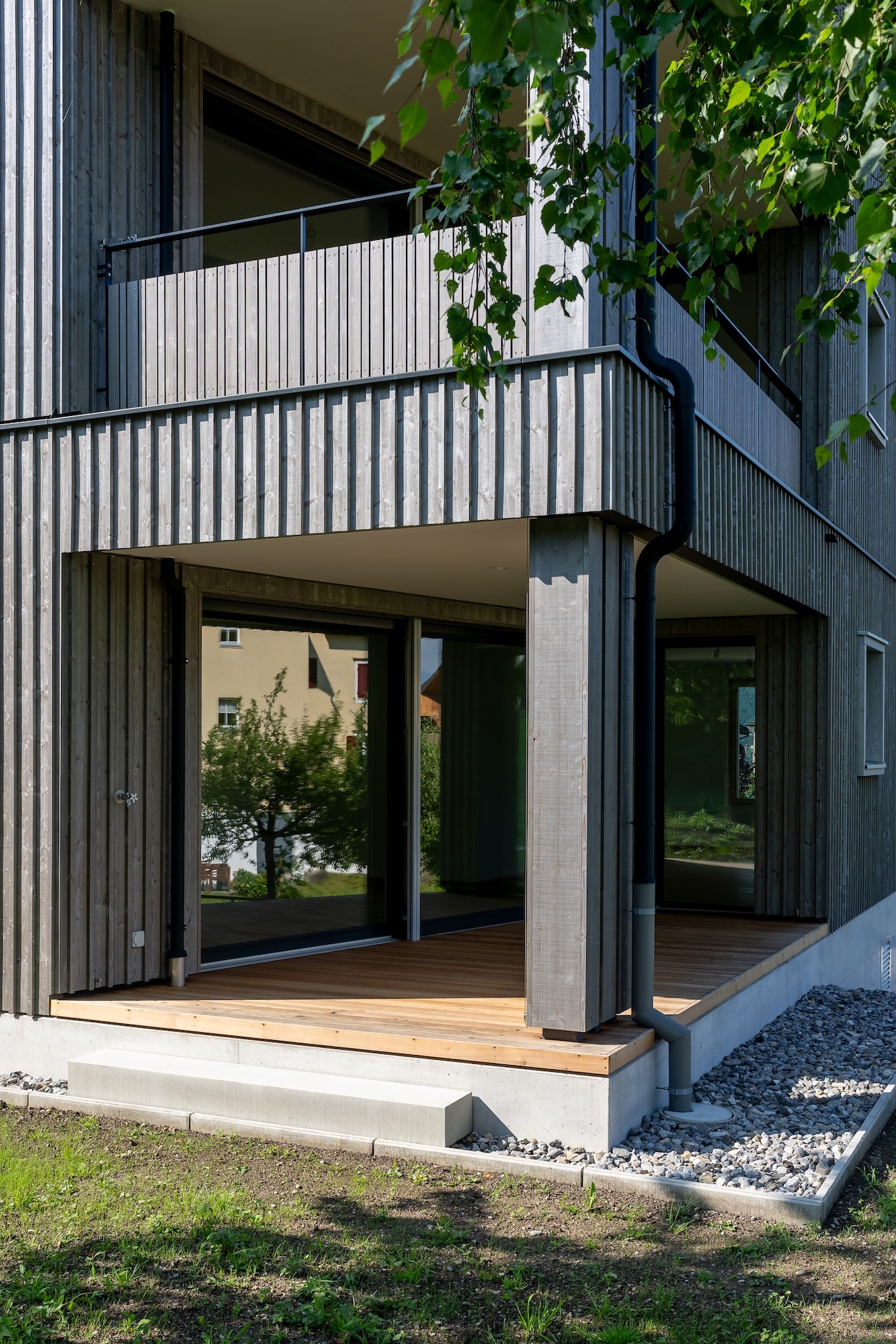 Der Wohnungsneubau wurde als dreigeschossiger Holzbau erstellt. Die Zufahrt erfolgt von der Dorfstrasse. Der Hauszugang befindet sich auf der Nordostseite des Gebäudes. Die Erschliessung erfolgt über ein grosszügig dimensioniertes und natürlich belichtetes Treppenhaus. Im Untergeschoss befinden sich die Kellerräume, Trockenraum für sämtliche Wohnungen, Technikraum und eine Garage. Die zwei 3 1/2- und die 4 1/2-ZImmer-Wohnungen verfügen jeweils über zwei Nasszellen, ein Reduit und eine nach Südost ausgerichtete Loggia. Die Wohnungen orientieren sich Richtung Nordost / Südost. Die zweigeschossige 4 1/2-Zimmer-Wohnung ist über eine Spindeltreppe miteinander verbunden. Die Liegenschaft wurde mit erhöhtem Schallschutz ausgeführt. Die Wärmeerzeugung erfolgt mittels Fernwärme. Der Bauherr strebt für das Gebäude eine Minergie-Zertifizierung an.