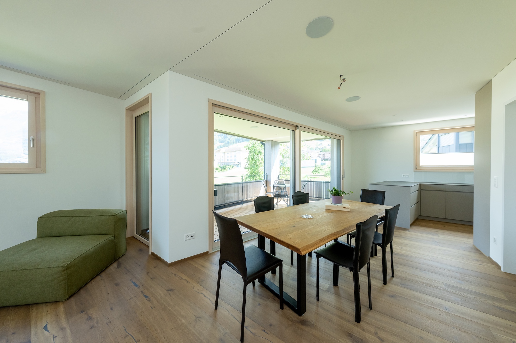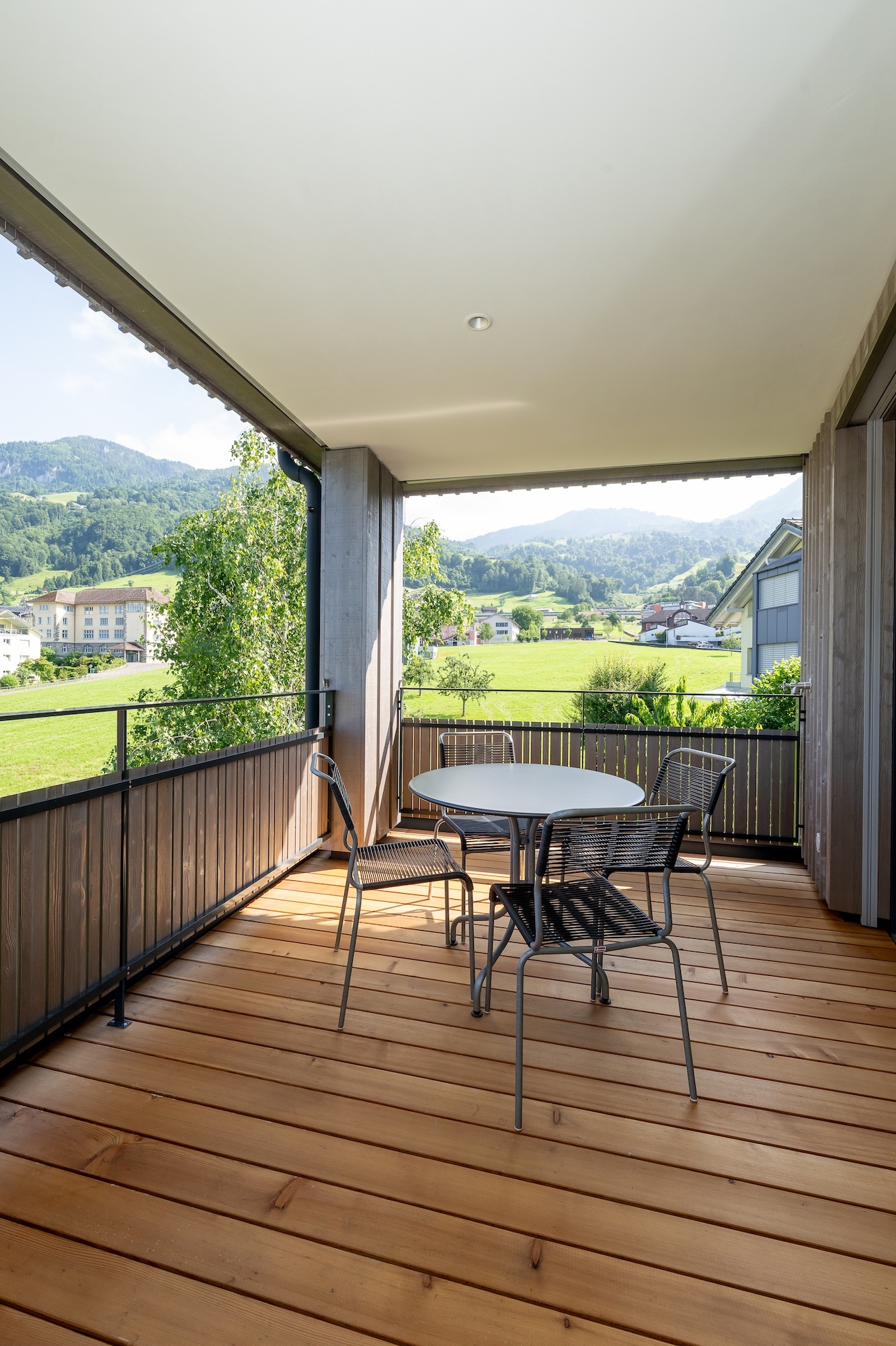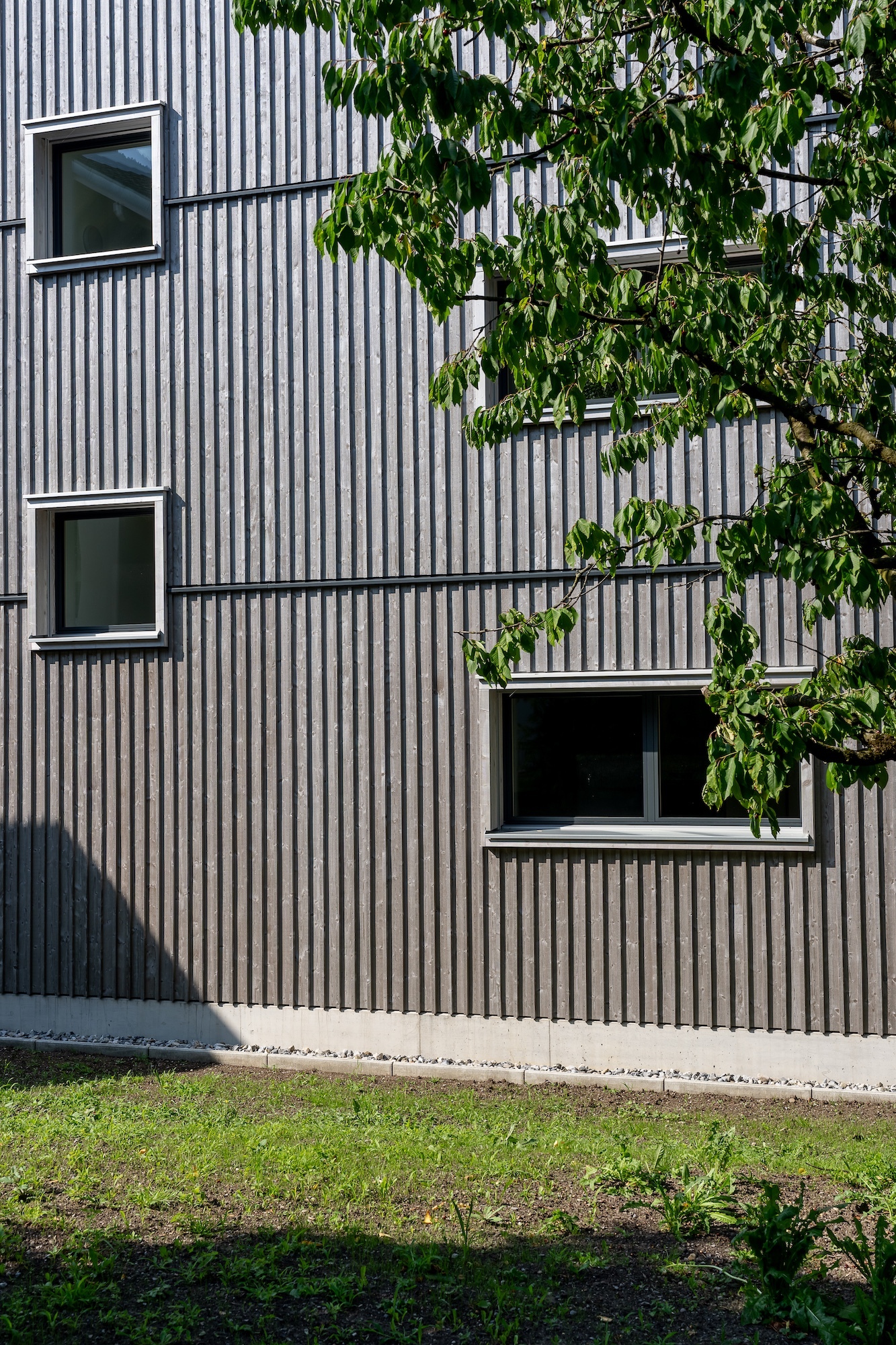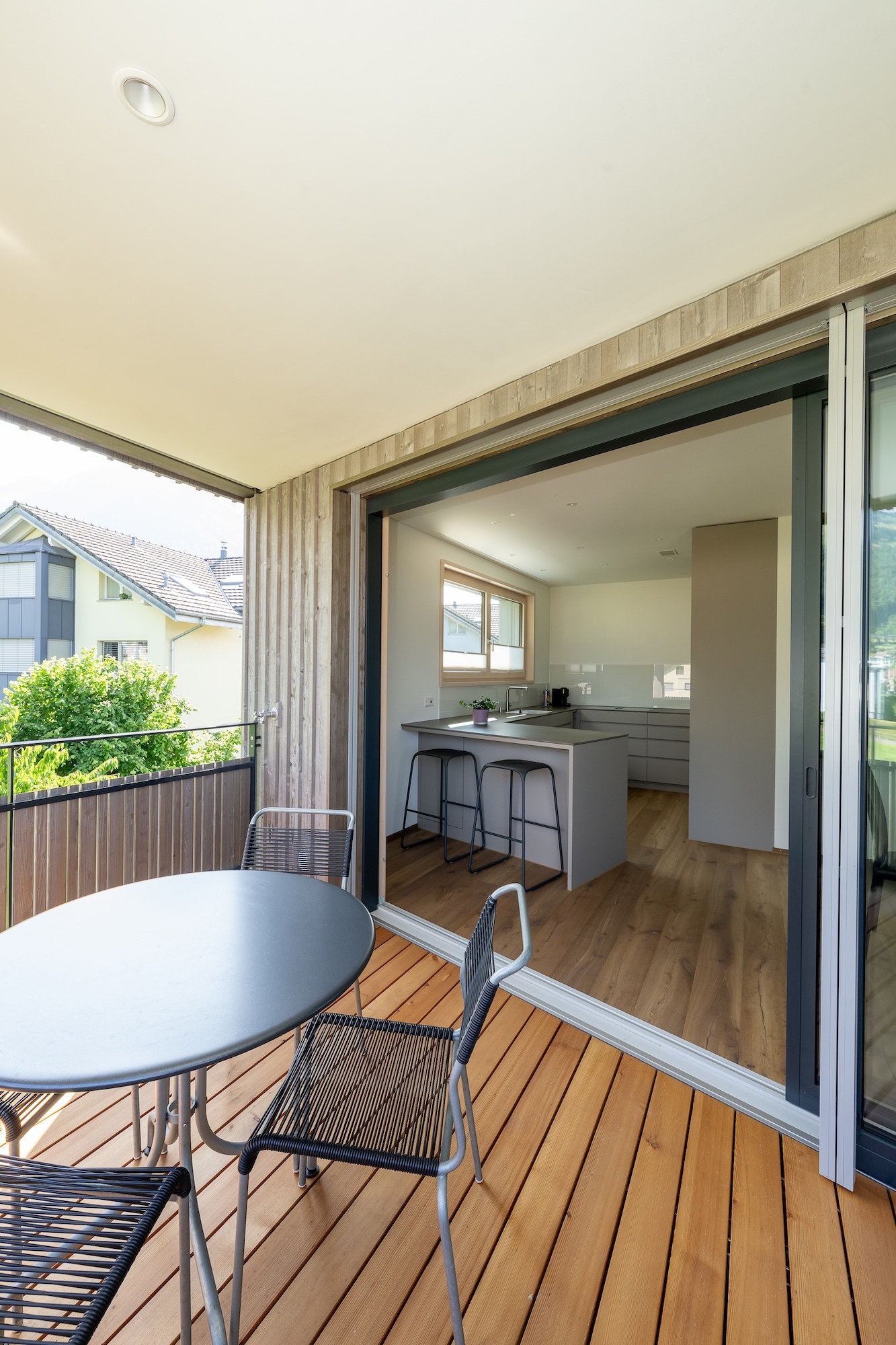 Der Wohnungsneubau wurde als dreigeschossiger Holzbau erstellt. Die Zufahrt erfolgt von der Dorfstrasse. Der Hauszugang befindet sich auf der Nordostseite des Gebäudes. Die Erschliessung erfolgt über ein grosszügig dimensioniertes und natürlich belichtetes Treppenhaus. Im Untergeschoss befinden sich die Kellerräume, Trockenraum für sämtliche Wohnungen, Technikraum und eine Garage. Die zwei 3 1/2- und die 4 1/2-ZImmer-Wohnungen verfügen jeweils über zwei Nasszellen, ein Reduit und eine nach Südost ausgerichtete Loggia. Die Wohnungen orientieren sich Richtung Nordost / Südost. Die zweigeschossige 4 1/2-Zimmer-Wohnung ist über eine Spindeltreppe miteinander verbunden. Die Liegenschaft wurde mit erhöhtem Schallschutz ausgeführt. Die Wärmeerzeugung erfolgt mittels Fernwärme. Der Bauherr strebt für das Gebäude eine Minergie-Zertifizierung an.
