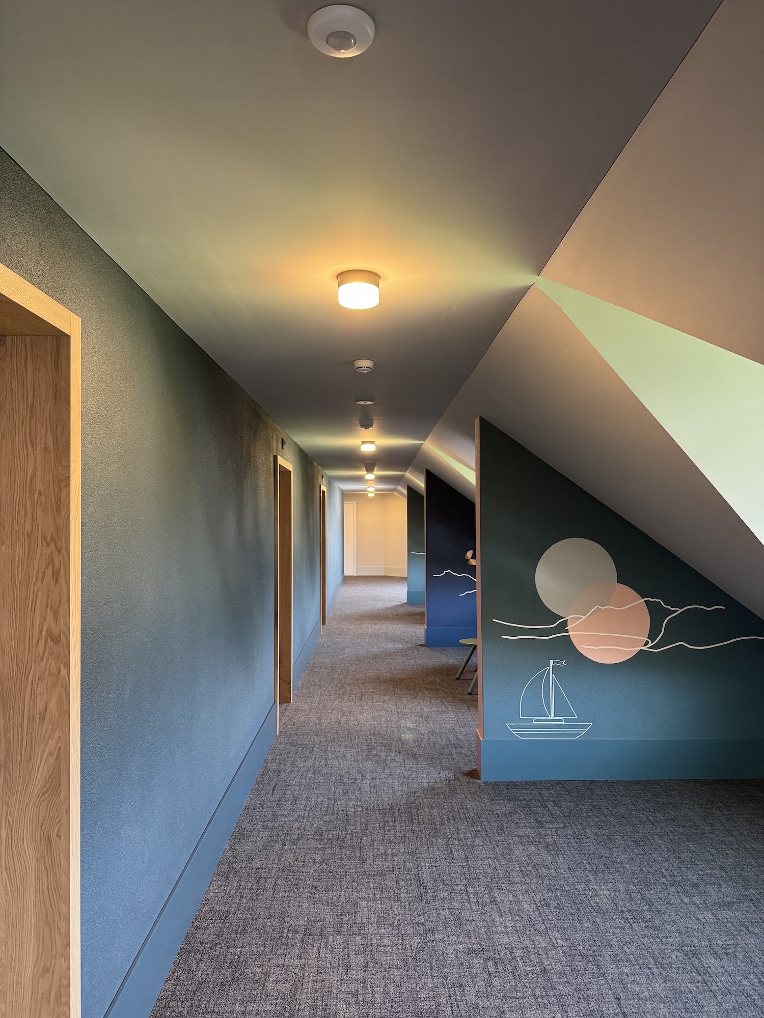 Auch im westlichen Gebäudeteil wurde der Bestand intelligent neu organisiert: Eine ehemals zweigeschossige Maisonette-Wohnung wurde in zwei grosszügige Suiten mit Terrassen im 4. Obergeschoss sowie in vier zeitgemässe Personalzimmer im darüberliegenden 5. Obergeschoss aufgeteilt. Im Ostflügel des 4. Obergeschosses wurden bestehende 1-Zimmer-Apartments einer umfassenden Sanierung unterzogen. Sie erhielten ein frisches, funktionales Design, wurden technisch auf den neuesten Stand gebracht und teilweise zu weiteren Familienzimmern zusammengelegt.